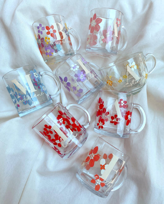 FLORAL GLASS MUG with CUSTOM LETTER (REGULAR MUG)