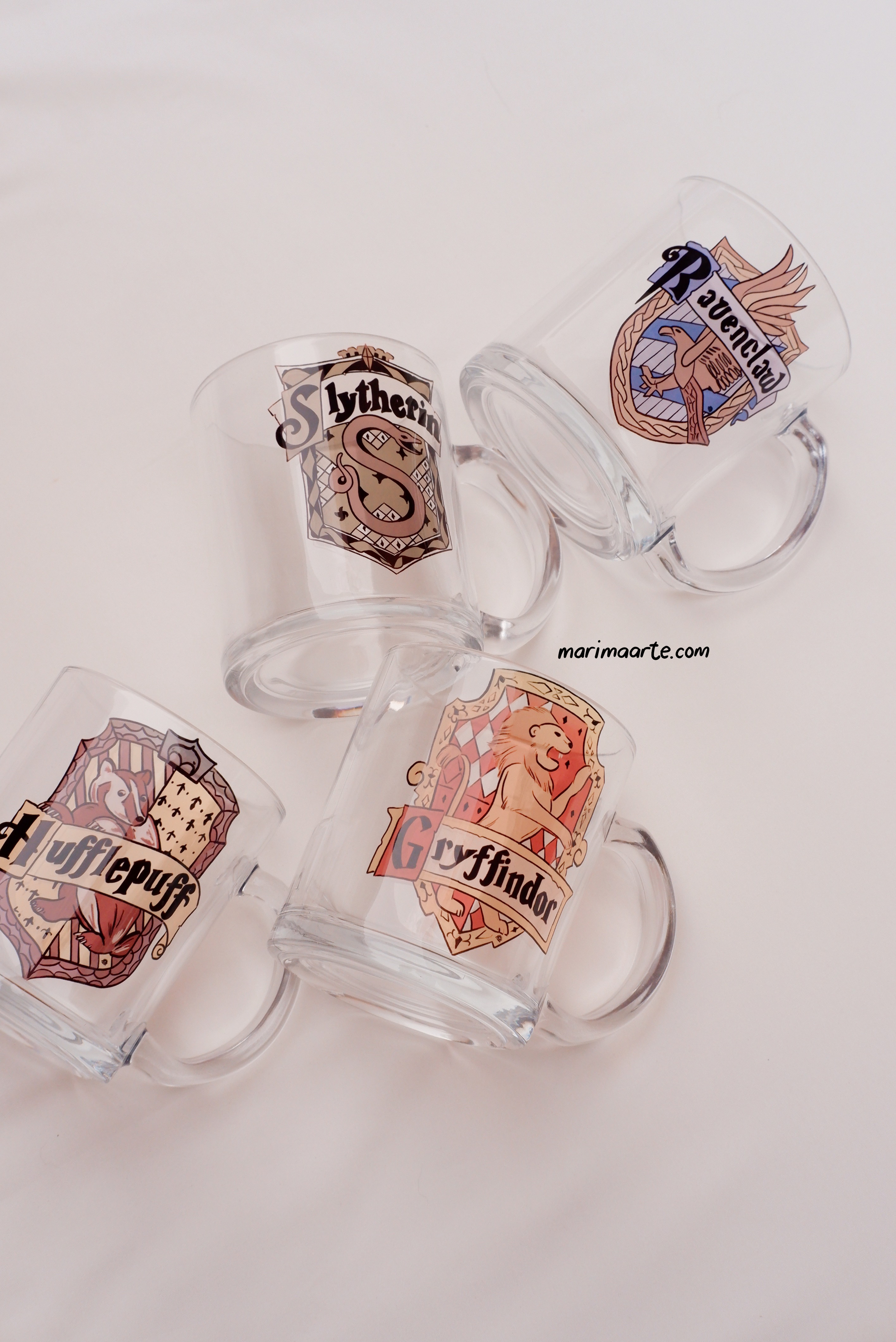 HOGWARTS HOUSE CLEAR GLASS MUG WITH HOUSE EMBLEM.