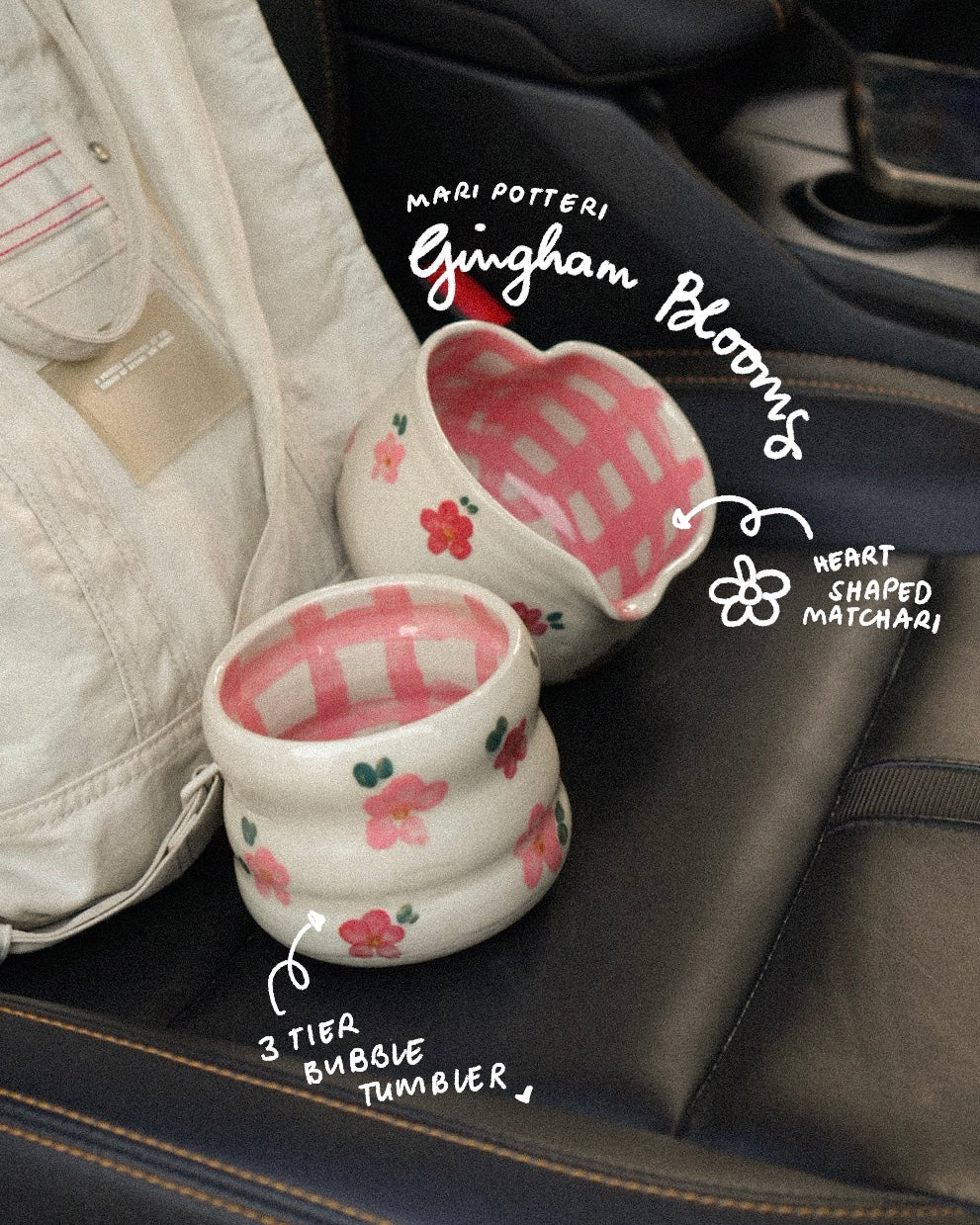MARI POTTERI GINGHAM BLOOMS ( matchari , tumbler & chasen holder )