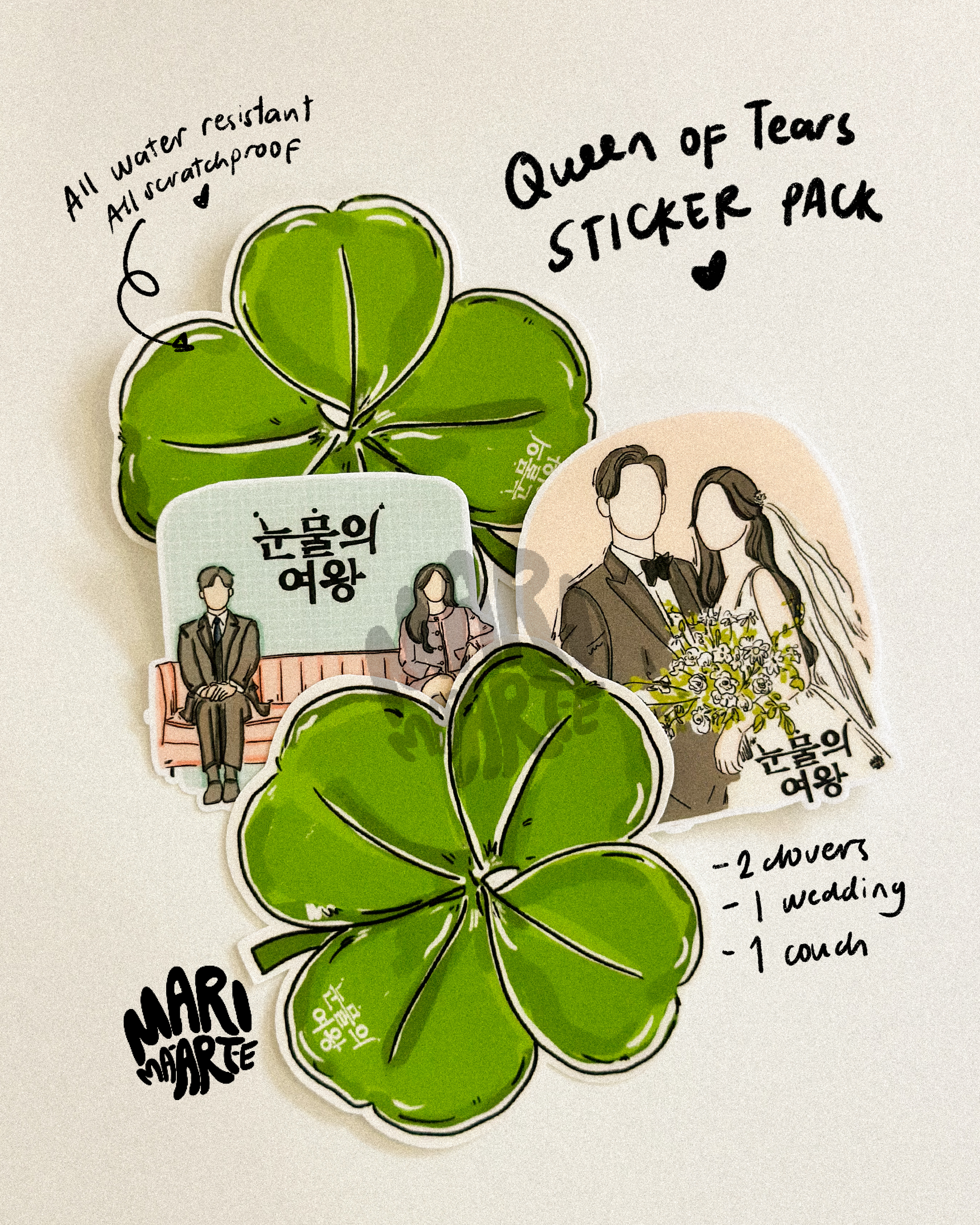 Experience the kilig of QOT from the QUEEN OF TEARS STICKER PACK. Featuring hand-drawn designs, each sticker is water-resistant and scratchproof. ❤️